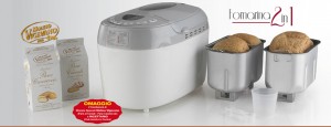 Fornarina 2 in 1 è una macchina di ultima generazione per la preparazione di pane, torte e marmellate. Prende il nome dalla particolare dotazione all’interno della macchina di 2 cestelli antiaderenti removibili grazie ai quali è possibile realizzare e cuocere due forme di pane da 450 gr. l’una o una sola da 900 gr. Basta inserire gli ingredienti e 2 lame impastatrici e 11 programmi digitali faranno il resto; grazie al timer programmabile (può partire fino a 13 ore dopo l’impostazione) e alla scelta tra 3 livelli di doratura (leggera, media e ben cotto) otterrete facilmente un ottimo pane fatto in casa (che la macchina mantiene in caldo per un’ora).